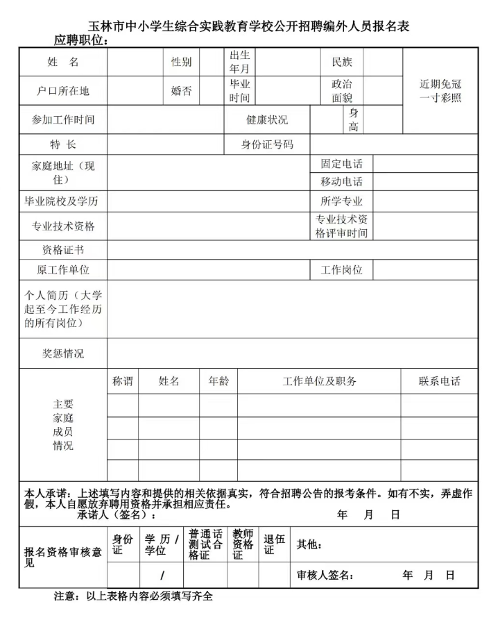 (2)应聘人员需携带《玉林市中小学生综合实践教育学校公开招聘编外人员报名表》一份、本人近期的一寸彩色照1张、身份证、学历证、学位证、退役军人证、资格证书、荣誉证书、工作经历证明(有工作经历的需提供)等相关原件、复印件到校,由现场报名工作人员对申请人专业、学历、职称以及工作经历等条件是否符合报考岗位基本要求进行资格审查。